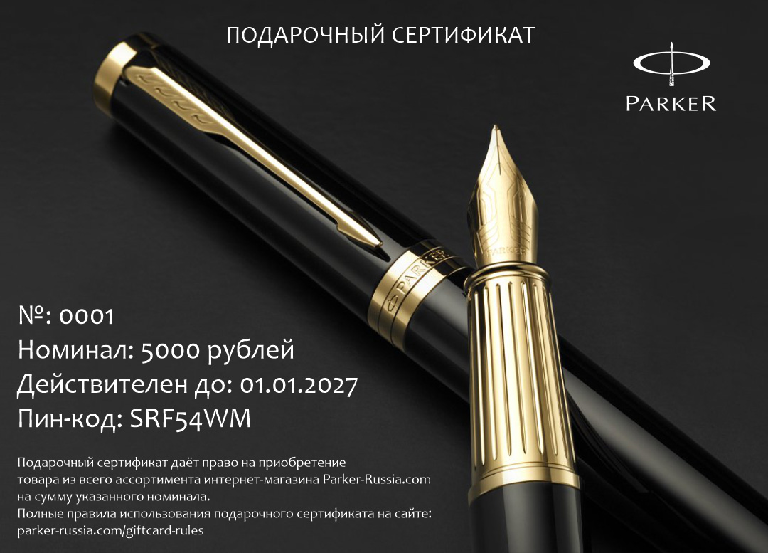Подарочный сертификат Parker 7000 от официального дилера Parker в Калуге. Вы можете дополнительно заказать гравировку, которая подчеркнет Вашу оригинальность и придаст памятность статусному подарку. Все ручки Паркер поставляются в фирменном футляре.